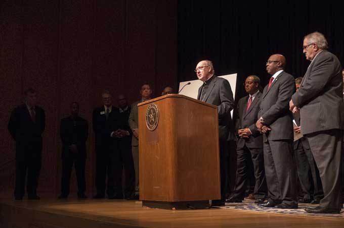 Bishop Kevin J. Farrell stands with civic leaders Feb. 12 at the Dallas Museum of Art and extends support to the Men Against Abuse rally scheduled for March 23.