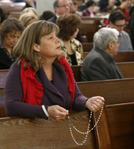 Monica Ashour prays before a noon Mass for Benedict XVI at the Cathedral Shrine of the Virgin of Guadalupe on Feb. 28. (RON HEFLIN/Special Contributor)