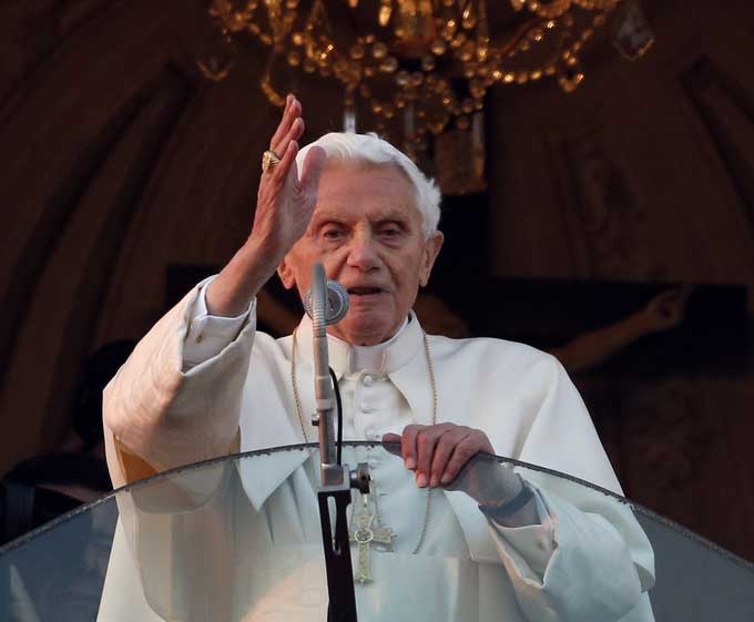 Pope Benedict XVI blesses people gathered in the town square after arriving in Castel Gandolfo, Italy, Feb. 28. It was his final public appearance before he drew to a close his papacy. “I am a simple pilgrim who begins the last stage of his pilgrimage on this earth,” he told the crowd. (CNS photo/Tony Gentile, Reuters)