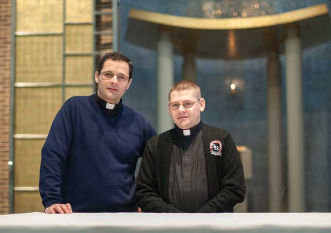 At St. Bernard of Clairvaux Catholic Church, Father Gustavo Domenech, left, and Father Gaston Giacinti, both from Argentina, are excited for their countryman, Pope Francis, the first South American pope. (JENNA TETER/The Texas Catholic)