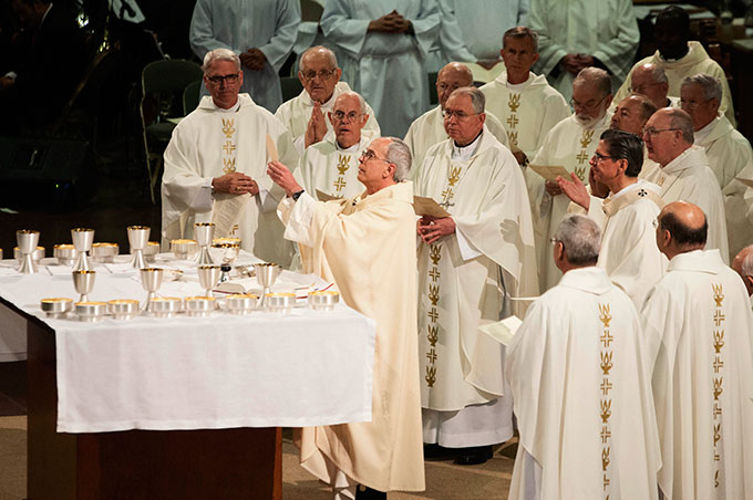 Bishop Mark J. Seitz offers the Eucharist during the consecration during his installation Mass as the sixth bishop of the Diocese of El Paso July 9 at the Civic Center. (JENNA TETER/The Texas Catholic)