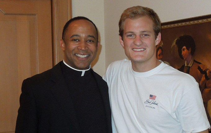 Fr. Tony Lackland provides prayerful pre-game talks each week for LSU kicker and Jesuit alum James Hairston. (Courtesy Photo)