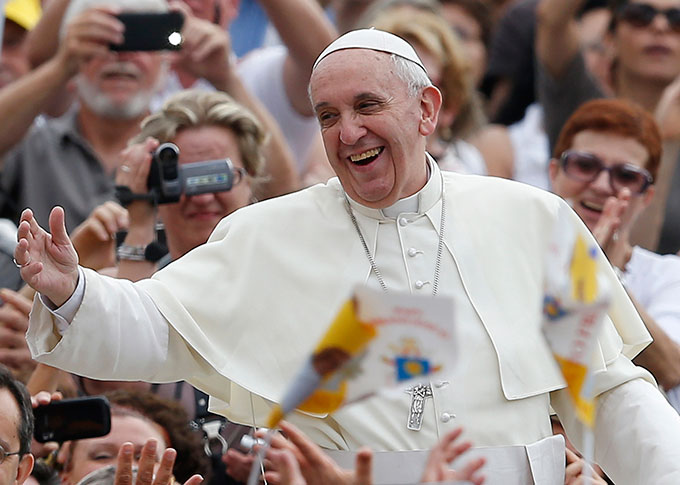 Pope Francis greets the crowd as he arrives to lead his general audience in St. Peter’s Square at the Vatican Sept. 11. (CNS photo/Paul Haring)