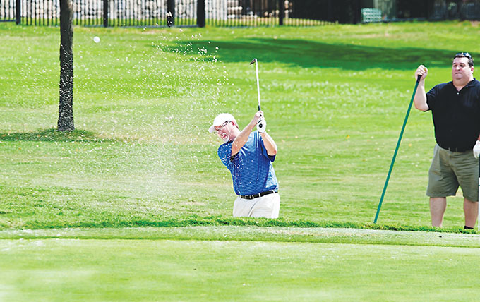 Thomas Codd watches teammate Dave Thompson tee off from the sand trap on the TPC golf course at the Four Seasons Club and Resort September 16 during the Bishop’s Invitational in Irving. (Jenna Teter/Texas Catholic)