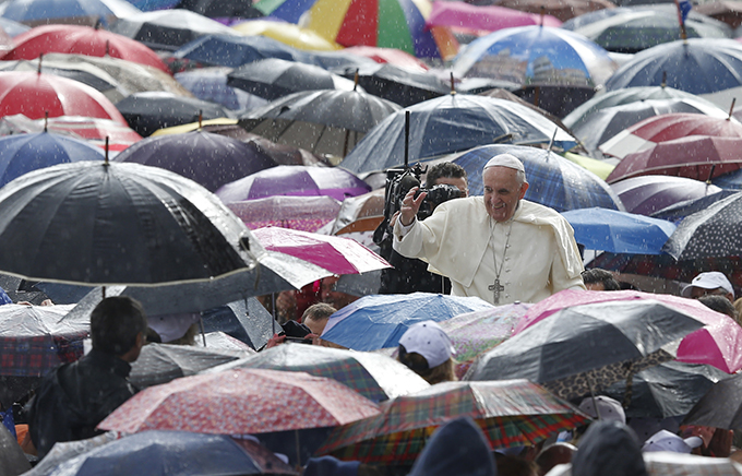 Rain falls as Pope Francis arrives to lead his general audience in St. Peter’s Square at the Vatican Oct. 9. (CNS photo/Paul Haring)