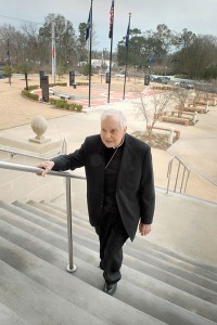 Retired Archbishop Philip M. Hannan of New Orleans, a proponent of daily exercise, is seen climbing the 62 steps of the courthouse in Covington, La., which he did several times a day well into his mid-90s. Archbishop Hannan, a World War II paratroop chaplain who befriended and secretly counseled John F. Kennedy during and after his historic run for the White House as the first U.S. Catholic president, died Sept. 29 at age 98. (CNS photo/Frank J. Methe, Clarion Herald)