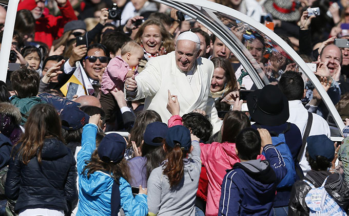 Pope Francis greets the crowd as he arrives to lead his general audience in St. Peter’s Square at the Vatican April 16. (CNS photo/Paul Haring)