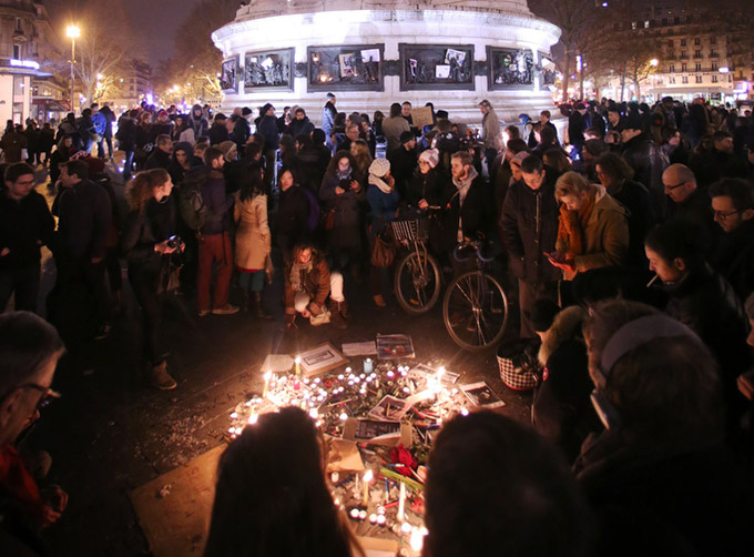 People light candles as they gather in Paris to commemorate the victims and condemn the killings at offices of Charlie Hebdo, a satirical newspaper, Jan. 7. Pope Francis condemned the killings of at least 12 people at the offices of the publication Jan. 7 and denounced all “physical and moral” obstacles to the peaceful coexistence of nations, religions and cultures. (CNS photo/Fredrik Von Erichsen, EPA)