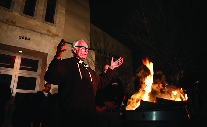 Father Timothy Gollob, pastor of Holy Cross Catholic Church, leads a prayer on Feb. 17 as he burns representative documents from a loan paid off by the church in celebration of retiring a construction debt. About 200 parishioners gathered at the church on Feb. 17 for a Mardi Gras celebration that included food, dancing and the burning of dried palms, individual intentions and a mortgage note signifying that the parish had paid off a 15-year $400,000 note in three years to completely pay off its $5 million sanctuary that was dedicated in 2011.