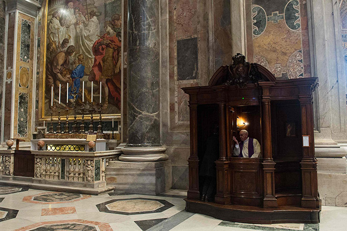 Pope Francis hears confession during a penitential liturgy in St. Peter’s Basilica at the Vatican March 28. Pope Francis surprised his liturgical adviser by going to confession during the service. (CNS photo/L’Osservatore Romano via Reuters)