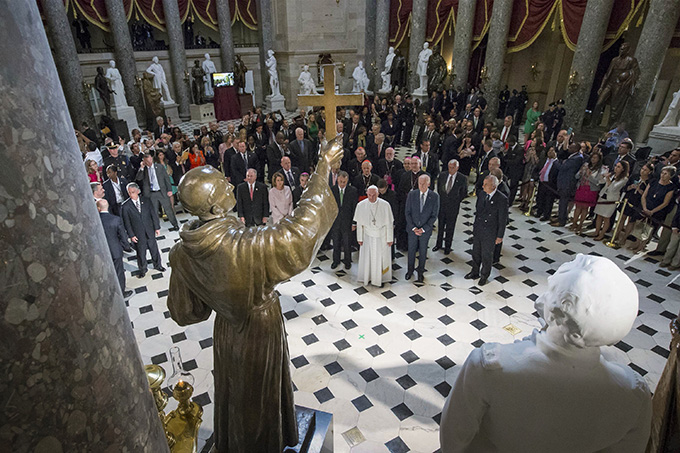 Pope Francis pauses in front of the sculpture of St. Junipero Serra in Statuary Hall at the U.S. Capitol in Washington Sept. 24. (CNS photo/Michael Reynolds, pool)