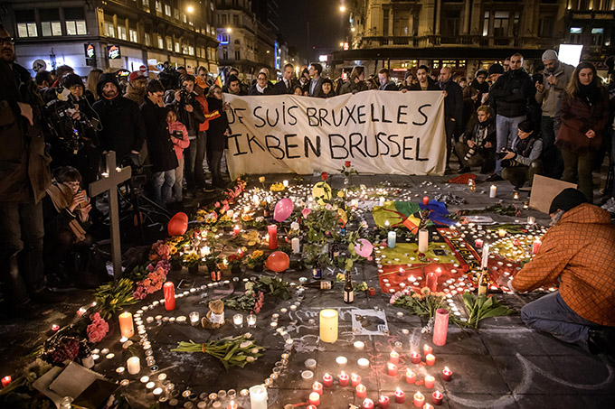 People gather at Place de la Bourse March 22 to pay tribute to the victims of the bomb attacks in Brussels. Three nearly simultaneous attacks that day claimed the lives of dozens and injured more than 200. (CNS photo/Christophe Petit Tesson, EPA)