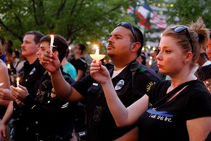 Dallas police officers hold candles during a vigil at city hall on July 11 in Dallas. Five police officers, including Officer Michael Krol, were killed on July 7 when a sniper opened fire during a protest in downtown Dallas. (KEVIN BARTRAM/Special Contributor)