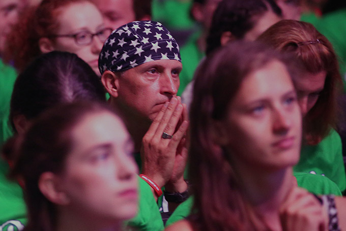 A U.S. World Youth Day pilgrim listens to Boston Cardinal Sean P. O’Malley speak July 27 at Tauron Arena in Krakow, Poland. (CNS photo/Bob Roller)