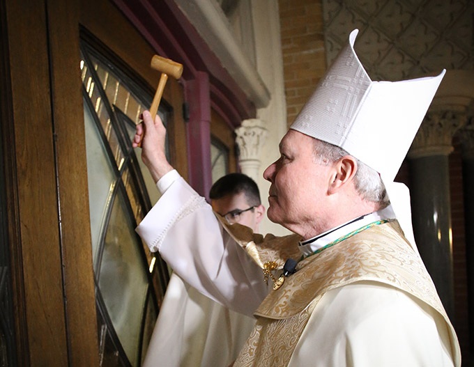 In a symbolic gesture prior to solemn vespers, Bishop Edward J. Burns knocks on the door of the Cathedral Shrine of the Virgin of Guadalupe on Feb. 8 as he prepares to become the eighth bishop of the Catholic Diocese of Dallas. (KEVIN BARTRAM/Special Contributor)