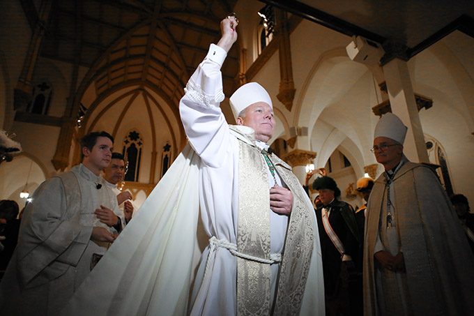 Bishop Edward J. Burns blesses those in attendance at Solemn Vespers before processing to the altar at the Cathedral Shrine of the Virgin of Guadalupe on Feb. 8. (KEVIN BARTRAM/Special Contributor)