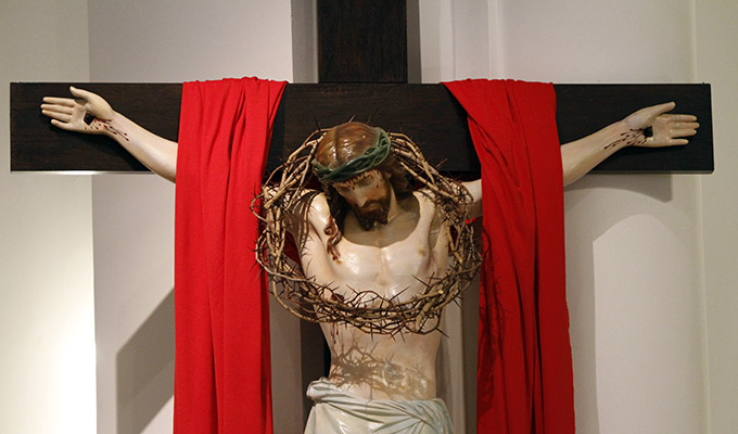 The crucifix is displayed with a crown of thorns and red banners during the celebration of Good Friday Mass at the Cathedral Shrine of Virgin of Guadalupe in March 2016. (BEN TORRES/Special Contributor)