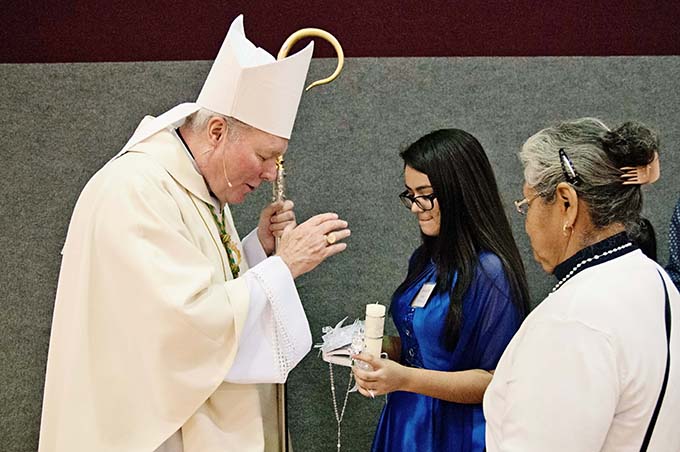 Bishop Edward J. Burns blesses Sarahi Puentes’s Confirmation gifts at a reception following Mass March 25 at St. Monica Catholic Church. (JENNA TETER/The Texas Catholic)
