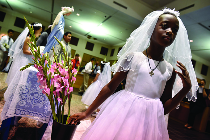 Gracie Nderi walks after placing a stem of flowers in front of a statue of the Virgin Mary during the May Crowning celebration on May 5 at Holy Family of Nazareth Catholic Church in Irving. (Ben Torres/Special Contributor)