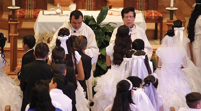 Father Luis Sierra, left, and Father Joseph Nguyen give Communion during a first Holy Communion Mass at Immaculate Conception Catholic Church in Grand Prairie on May 6. (KEVIN BARTRAM/Special Contributor)