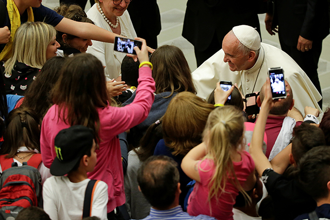 Pope Francis poses for a selfie as he arrives to lead a special audience for members of a middle school group June 2 at the Vatican. The middle-schoolers were part of Communion and Liberation’s “The Knights of the Grail” educational initiative. (CNS photo/Max Rossi, Reuters)