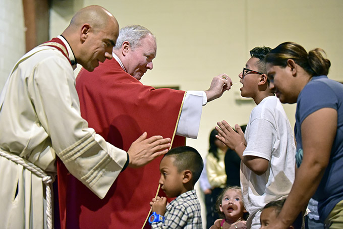 Bishop Edward J. Burns and Father Jesus Belmontes distribute Communion to parishioners during a special welcome Mass for the Bishop at San Juan Diego Catholic Church, Sunday, June 4, 2017 in Dallas. (Ben Torres/Special Contributor)