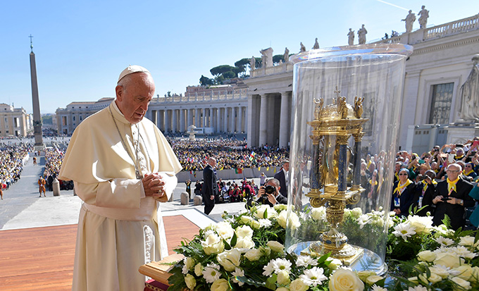 Pope Francis prays at a reliquary containing the heart of St. Vincent de Paul during an Oct. 14 audience in the Vatican’s St. Peter’s Square with members of Vincentian religious orders and groups inspired by the saint. (CNS photo/L’Osservatore Romano)
