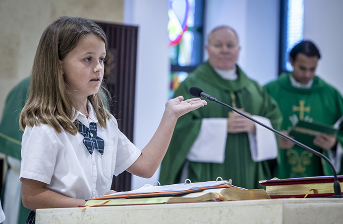 Penelope Puckett reads the petitions during the Mass celebrating the 25th anniversary of the St. Joseph Catholic School in Waxahachie on Oct. 8. (RON HEFLIN/Special Contributor)