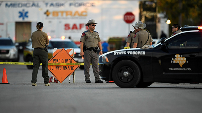 Law enforcement officers stand near the scene of a mass shooting Nov. 5 at the First Baptist Church in Sutherland Springs, Texas. A lone gunman entered the church during Sunday services taking the lives of at least 26 people and injuring several more. (CNS photo/Mohammad Khursheed, Reuters)