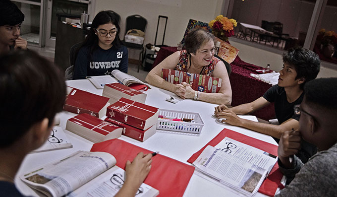Catechist Luz Santiago leads a table of RCIA candidates in a discussion on the Sacrament of Baptism during a class at St. Michael the Archangel Catholic Church in Garland Nov. 6. (JENNA TETER/The Texas Catholic)