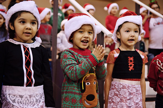 Clarissa Reyes, from left, Mason Villarreal and Mia Medina perform a Christmas carol for parents Dec. 5 during the Christmas program at Santa Clara of Assisi Catholic Academy. (JENNA TETER/The Texas Catholic)