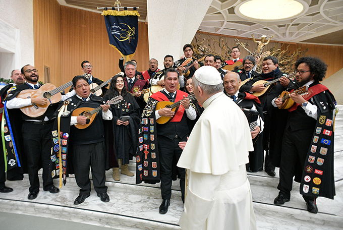 Pope Francis greets members of a student music group from Mexicoís Autonomous University of Queretaro at the end of his weekly general audience in Paul VI hall at the Vatican Dec. 20. (CNS photo/L’Osservatore Romano)