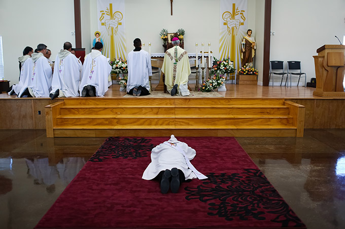 Ordinate-to-be Dang Dinh Nguyen lies prostrate before Auxiliary Bishop Greg Kelly during an ordination Mass at the Monastery of Thien Tam in Kerens, Texas on Jan. 13. (KEVIN BARTRAM/Special Contributor)