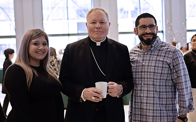 Bishop Edward J. Burns poses with registered nurse Magali Reynoso, left, and Dallas SWAT officer Darian Loera on Jan. 27 at the Cathedral Shrine of the Virgin of Guadalupe. The two used their medical training to help photographer Ron Helfin who had suffered cardiac arrest. (JENNA TETER/The Texas Catholic)