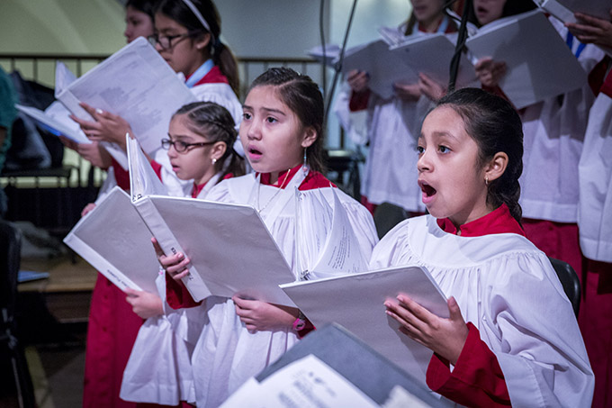 From left, Valeria Flores, Sarah Flores and Elisa Gonzalez sing with the Cathedral Children’s Choir at the Roe V. Wade Memorial Mass at the Cathedral Shrine of the Virgin of Guadalupe on Jan. 20. (RON HEFLIN/Special Contributor)