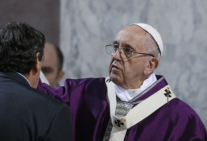 Pope Francis places ashes on a man’s forehead during Ash Wednesday Mass at the Basilica of Santa Sabina in Rome March 1. (CNS photo/Paul Haring) See POPE-ASHES March 1, 2017.