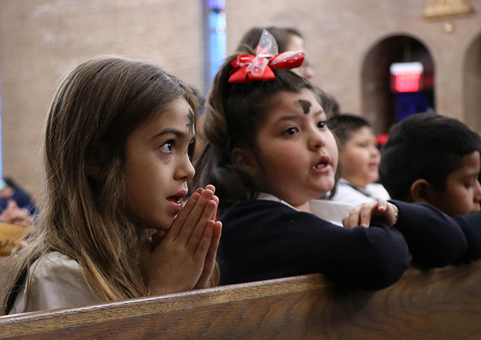 Elizabeth Kelsey, left, and Sara Pina recite a Hail Mary at the conclusion of an Ash Wednesday Mass at St. Mary of Carmel Catholic Church on Feb. 14. (MICHAEL GRESHAM/The Texas Catholic)