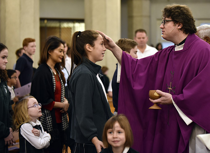Father Joshua Whitfield distributes ashes during a morning Mass for Ash Wednesday at St. Rita Catholic Church on Feb. 14. (BEN TORRES/Special Contributor)
