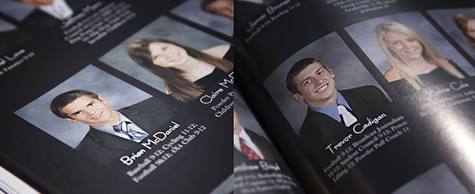 Bishop Lynch High School yearbook photos for Brian McDaniel and Trevor Cadigan. (JENNA TETER/The Texas Catholic)