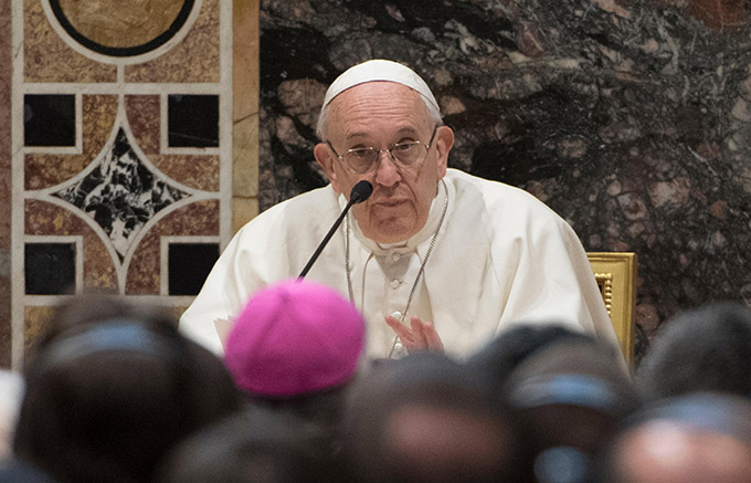 Pope Francis speaks April 10 to some 550 “missionaries of mercy” in the Sala Regia of the Apostolic Palace at the Vatican. The pope, who originally commissioned the priests during the Year of Mercy, has extended indefinitely their special mission of preaching God’s mercy and showing it, especially through the sacrament of reconciliation. (CNS photo/Vatican Media)