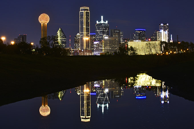 The Dallas skyline is lighted gold April 9 to highlight the launch of the Diocese of Dallas’ #BeGolden initiative. (Ben Torres/Special Contributor)