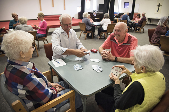 On this day, everyone in the “youth” room was between 60 and 94 — which caused some of the retirees to grin as they examined their cards at the parish’s weekly Monday bridge gathering that the players said helps them stay sharp in mind, body and spirit.