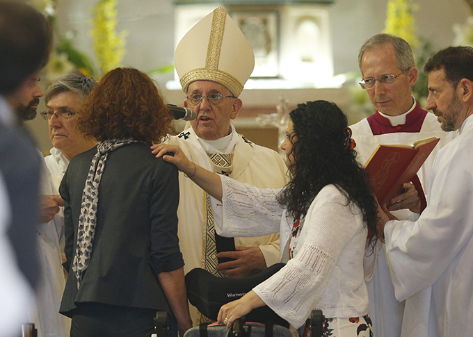 Pope Francis administers the sacrament of Confirmation to Paola Desideri while celebrating Mass at Blessed Sacrament Parish in Rome May 6. Desideri’s 12-year-old daughter, Maya, was also confirmed by the pope. (CNS photo/Paul Haring)
