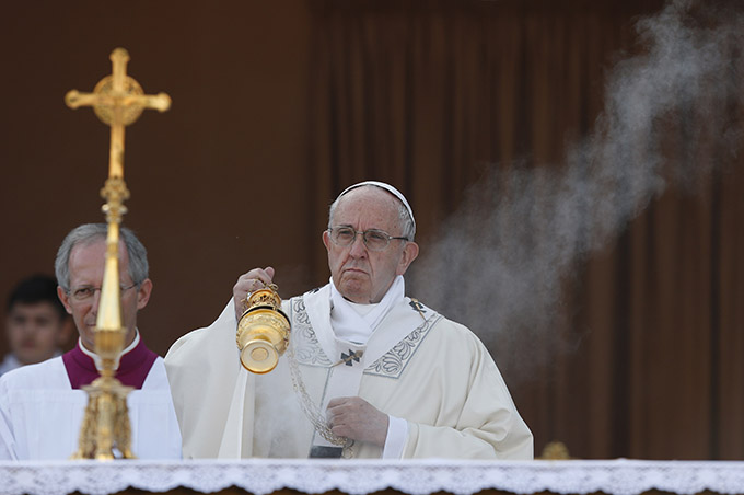 Pope Francis burns incense as he celebrates Mass marking the feast of Corpus Christi in Ostia, a suburb of Rome, June 3. (CNS photo/Paul Haring)