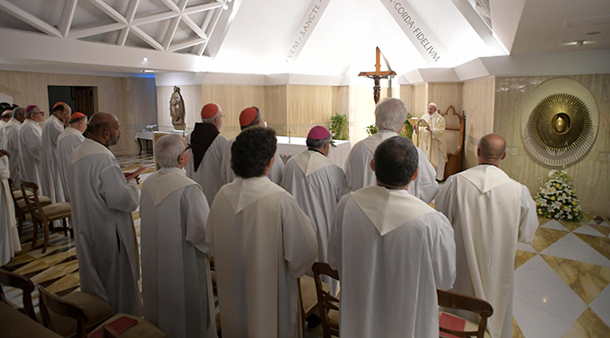 Pope Francis gives the homily as he celebrates morning Mass in the chapel of his residence, the Domus Sanctae Marthae, at the Vatican Sept. 10. Several members of the pope’s advisory Council of Cardinals were present at the Mass on the first of three days of council meetings. (CNS photo/Vatican Media)
