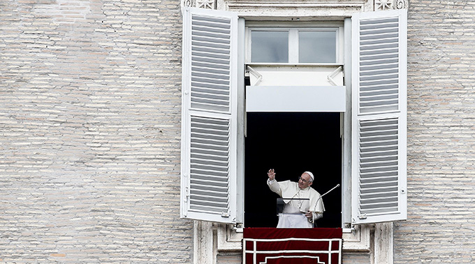 Pope Francis waves as he leads the Angelus Sept. 9 from the window of his studio overlooking St. Peter’s Square at the Vatican. (CNS photo/Favio Frustaci, EPA)