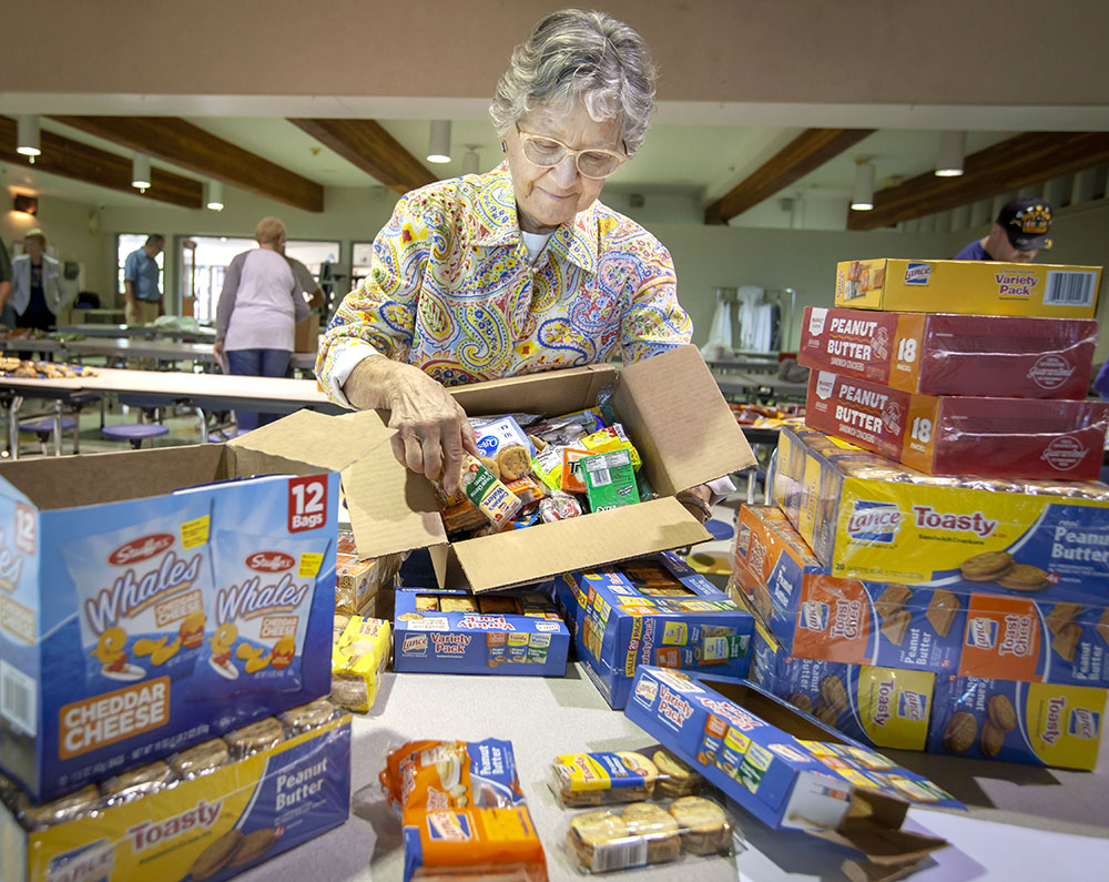 Honor our Heroes volunteer Betty Young helps pack boxes for service members at Prince of Peace Catholic Church in Plano, Texas, Sunday, Sept. 16, 2018. (Ron Heflin/Special Contributor)