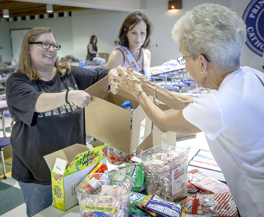 Kim Callait, left, accepts a hand full of candy from Katherine Tanner as the help pack boxes for service members at Prince of Peace Catholic Church in Plano, Texas, Sunday, Sept. 16, 2018. In the background, center, is Kathy Chaney. (Ron Heflin/Special Contributor)