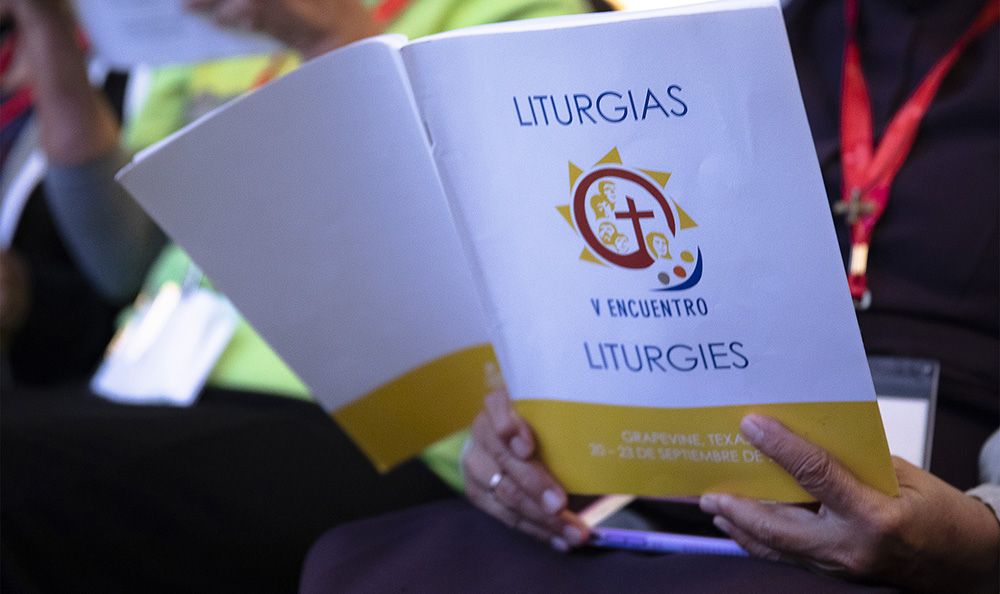 Delegates sing during morning prayer using a Spanish liturgy guide Sept. 22 during the Fifth National Encuentro, or V Encuentro, in Grapevine, Texas. The Sept. 20-23 event is a gathering of more than 3,200 Hispanic Catholic leaders and about 125 bishops from across the country. (CNS photo/Tyler Orsburn)