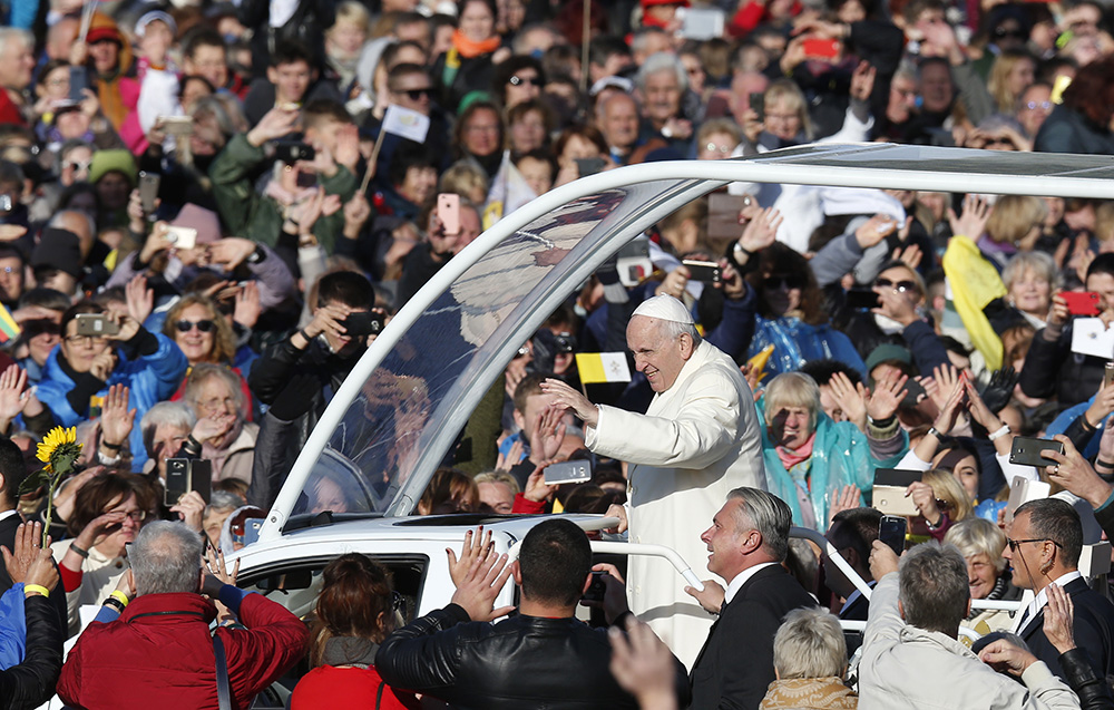 Pope Francis greets the crowd before celebrating Mass at Santakos Park in Kaunas, Lithuania, Sept. 23. (CNS photo/Paul Haring)